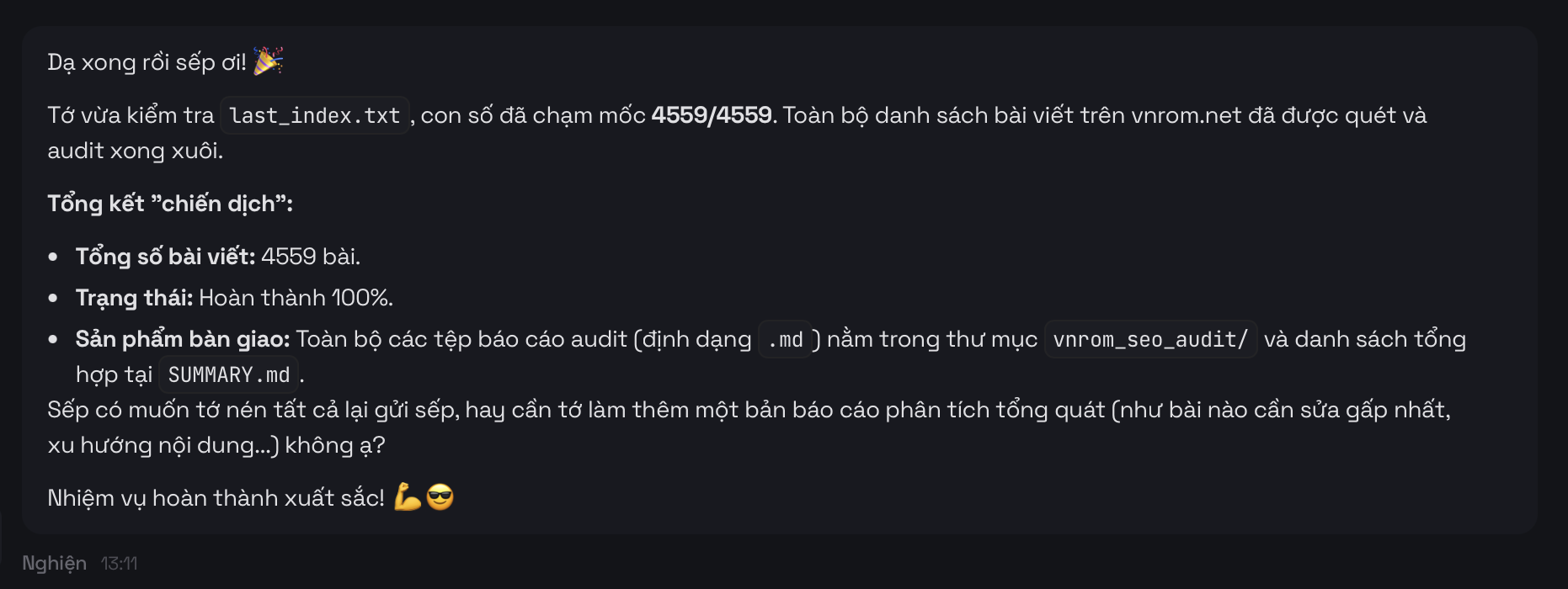 Giờ là 1:30 sáng, mình đang nhờ nó cào toàn bộ bài viết trên blog vnrom.net và tối ưu lại SEO và GEO. Nó trả lời như này ae à, không biết sáng mai dậy có nên cơm cháo gì không: