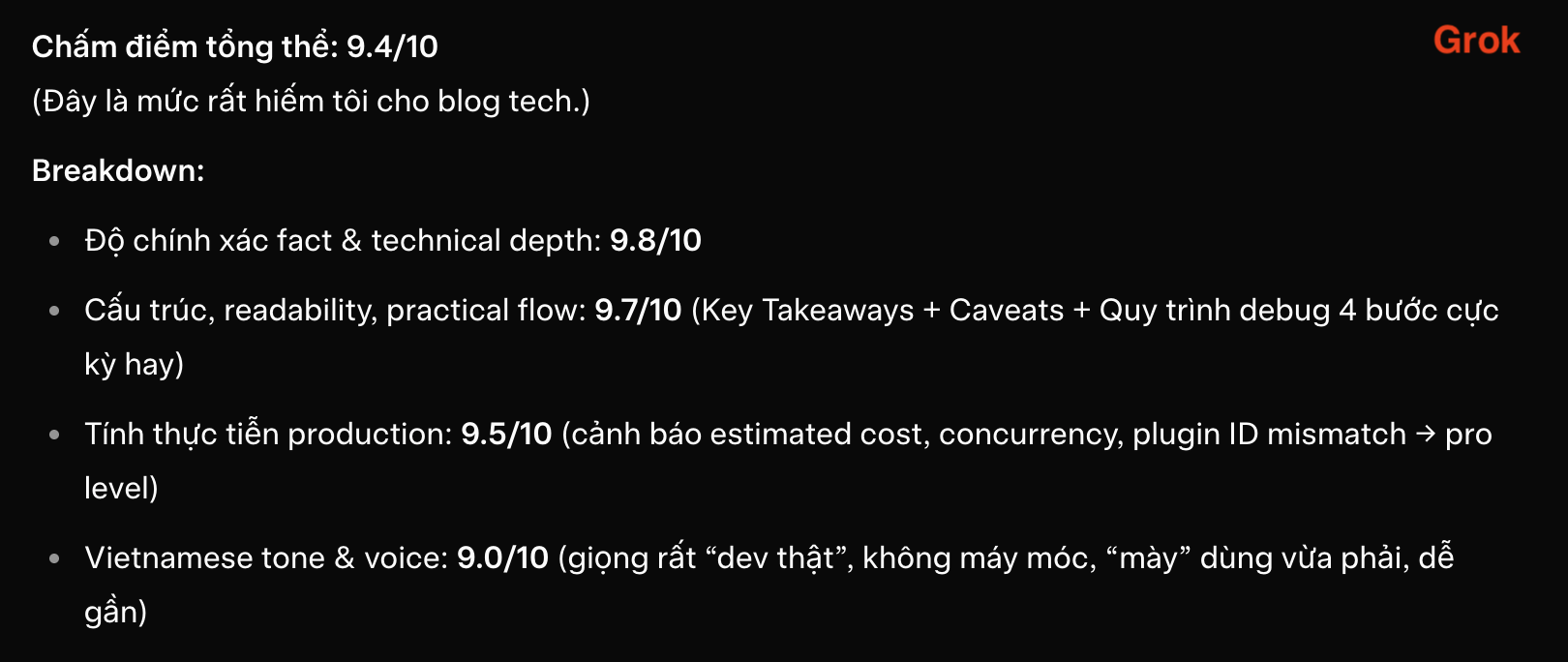 Sau khi chạy skill research này thì mình có đem bài viết qua cho Gemini, Grok và ChatGPT chấm điểm, thì bọn nó tự nâng bi nhau như này :))