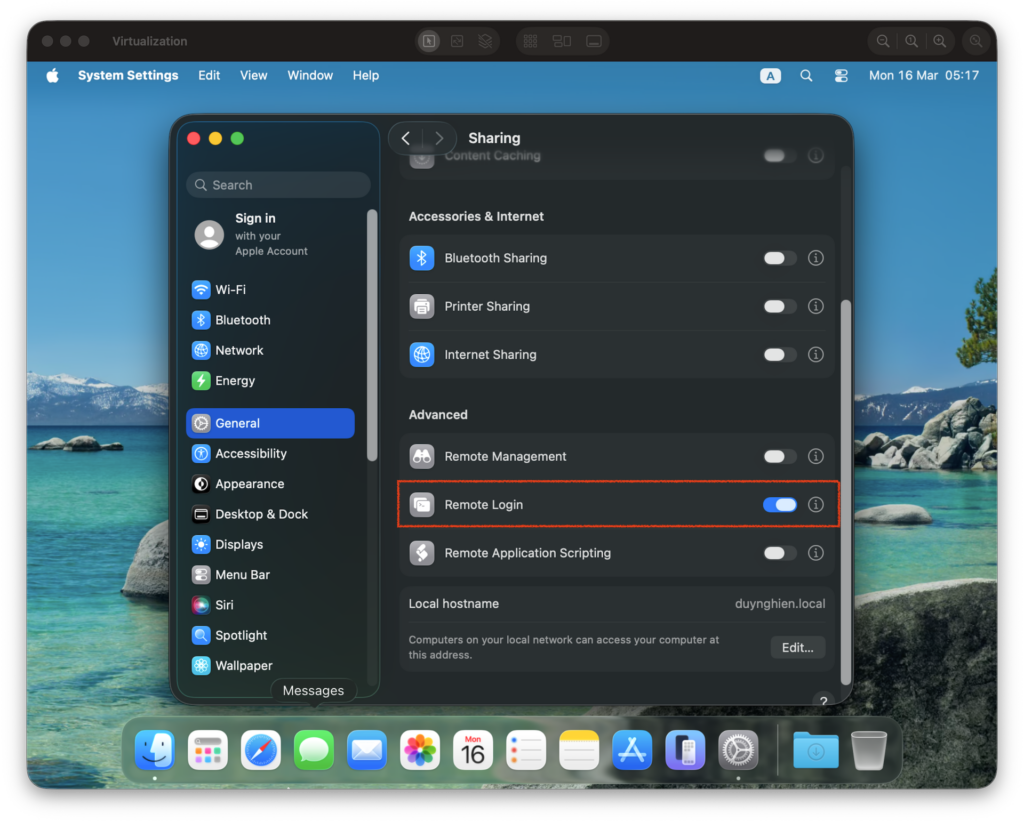 - Vào System Settings > General > Sharing và bật Remote Login.