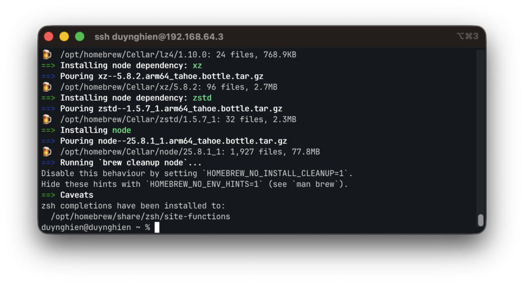 OpenClaw chạy trên nền Node.js (yêu cầu bản 22 trở lên). Ở trong giao diện SSH của máy ảo, anh em cài Homebrew rồi cài Node.js bằng 2 lệnh sau: