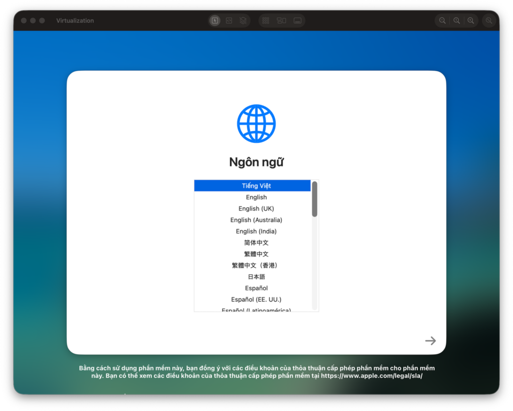 lume run openclaw - Cửa sổ màn hình máy ảo (VNC) hiện lên, anh em thao tác thiết lập hệ điều hành macOS như bình thường (tạo user, pass...).