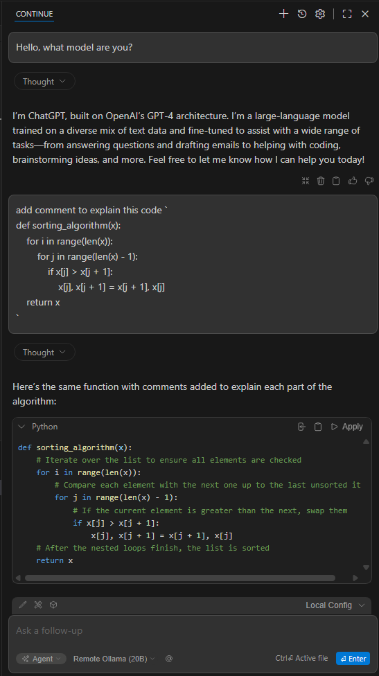Restart VSCode, chọn model Remote Ollama (20B) và trải nghiệm.