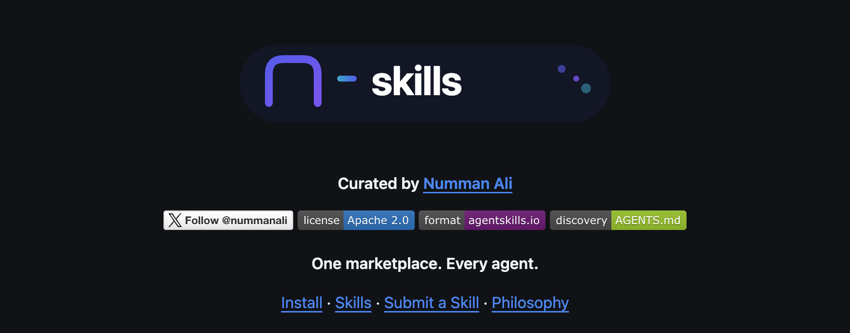 n-skills là một marketplace cho AI Agent skills – một kho lưu trữ các plugin, công cụ, và khả năng được cộng đồng tuyển chọn và xây dựng sẵn.