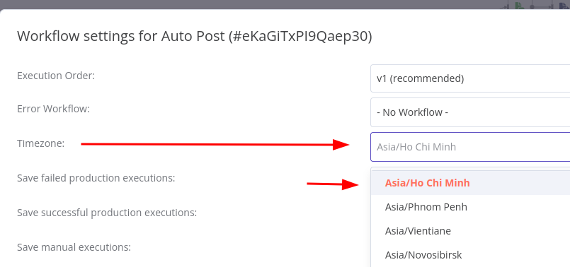 Đối với từng workflow cụ thể, bạn có thể điều chỉnh timezone như sau: