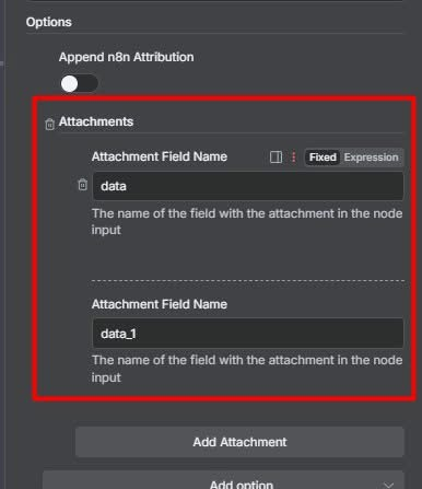 Bước 4: Trong node "Send Gmail", ở mục options bạn add và thêm vào trường "attachment field name", bạn chỉ cần điền các tên ở bước số 3 là done. Ví dụ: 2 file thì điền data và data_1, 3 file thì data , data_1 và data_2 (cứ thế nếu số lượng file nhiều hơn)