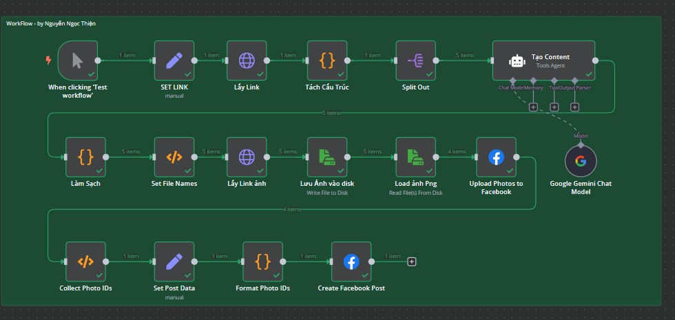 Như đã hứa hồi chiều, mình sẽ share JSON workflow sẽ lấy nội dung và hình ảnh trong 1 bài báo > post lên page facebook kèm hình ảnh đính kèm. Nội dung sẽ do AI viết lại.