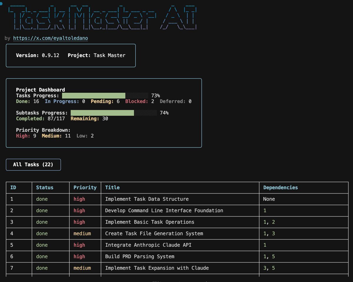 Task Master AI là một công cụ CLI mã nguồn mở mạnh mẽ, được phát triển bởi Eyal Toledano (@EyalToledano), giúp các lập trình viên và đội ngũ sản phẩm tận dụng AI (như Claude, Cursor, Windsurf, v.v.) để xây dựng dự án lớn một cách hiệu quả, có cấu trúc và ít rối loạn hơn.