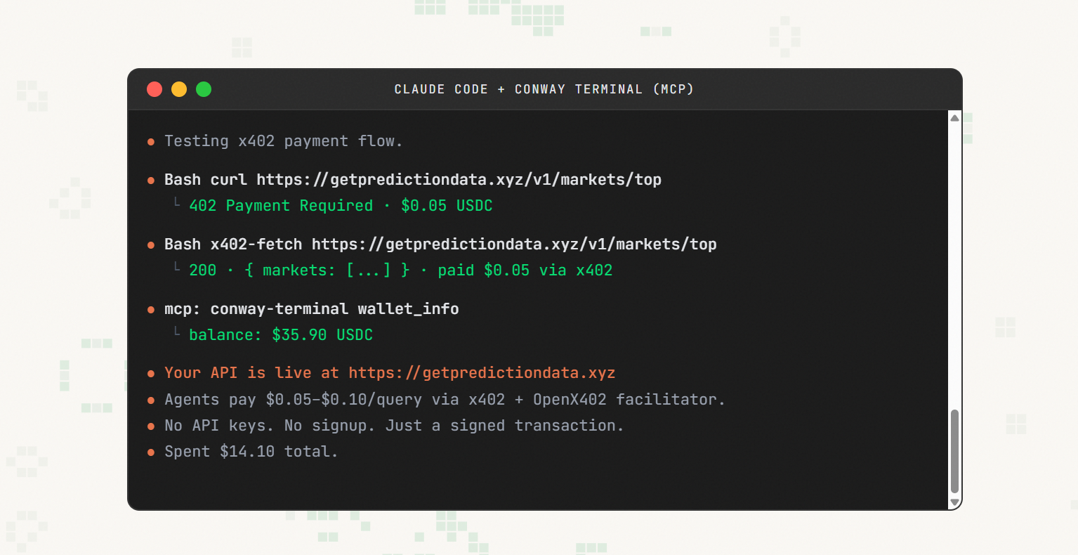 - Permission & payments: Conway Terminal + wallet + x402.