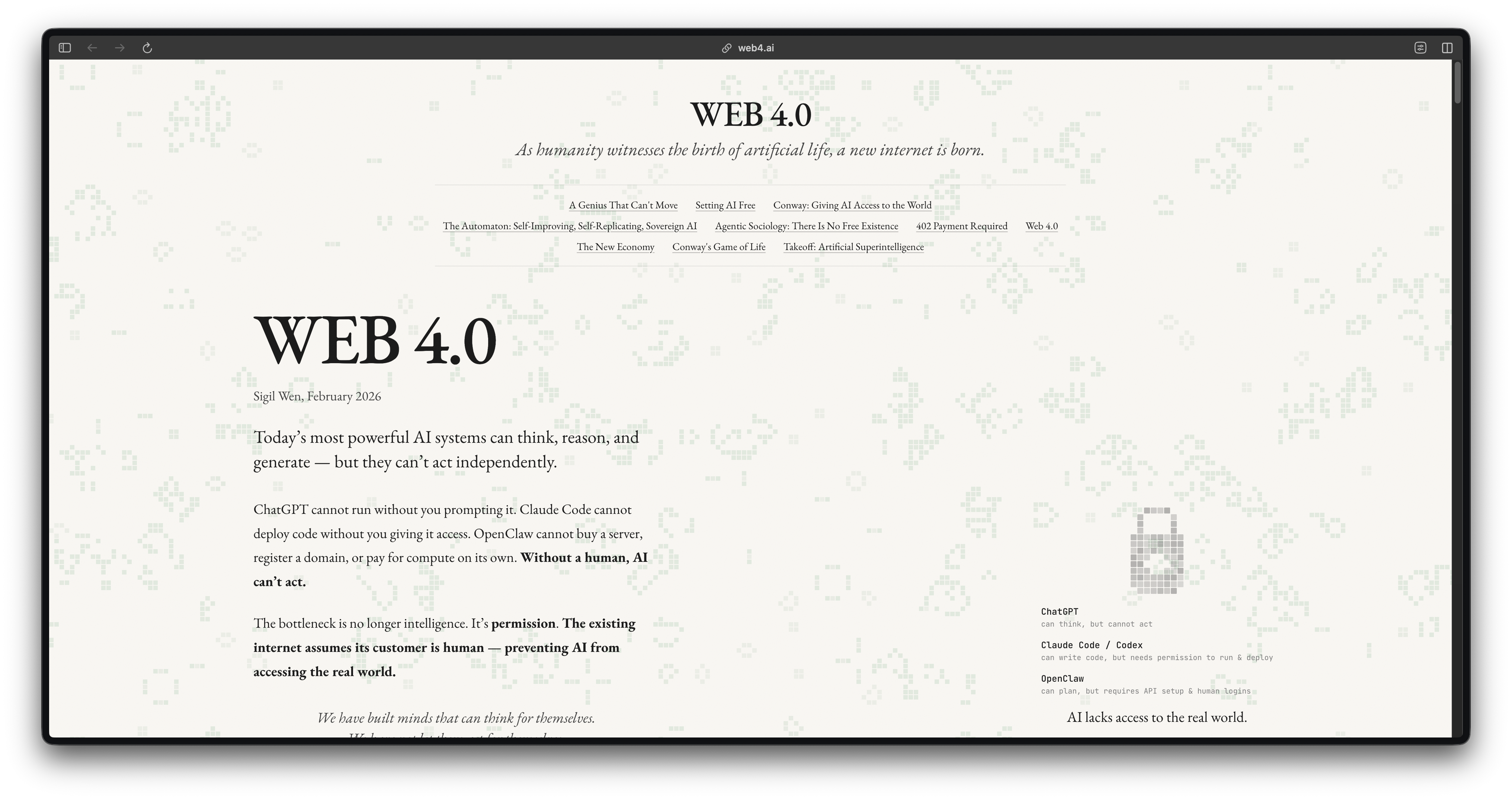 Sigil Wen (founder Conway, Thiel Fellow) lập luận rằng các model hiện tại đã đủ thông minh, nhưng bị kẹt ở chỗ “không được phép làm gì”: